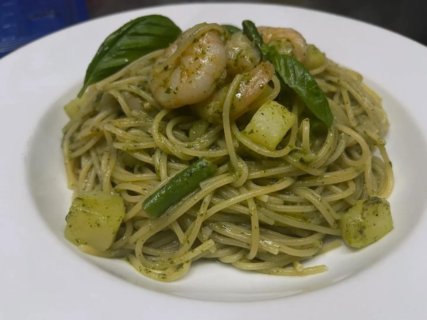 海老と季節野菜のジェノベーゼパスタ。